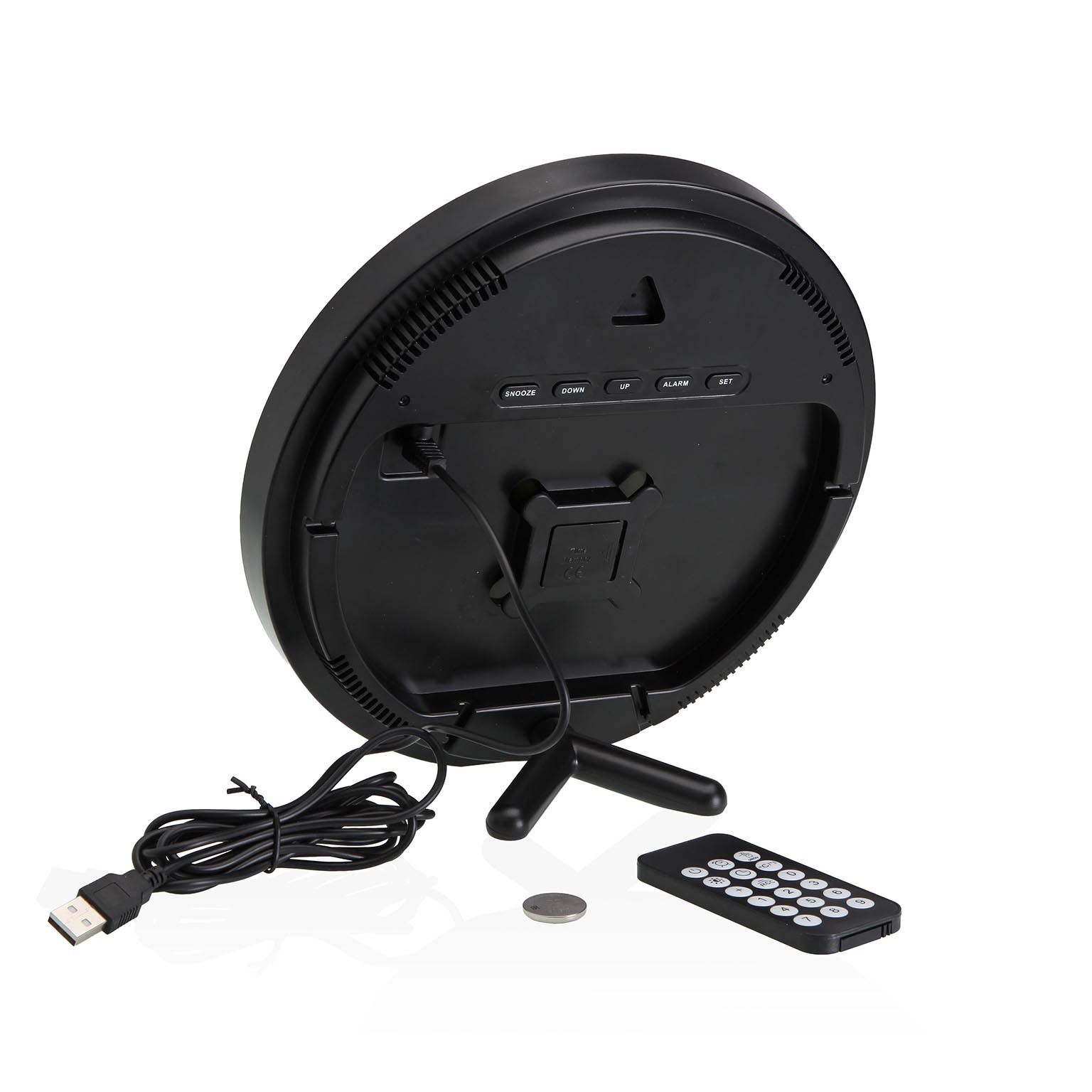 Enhance modern home spaces with this sleek black alarm clock featuring a remote control.