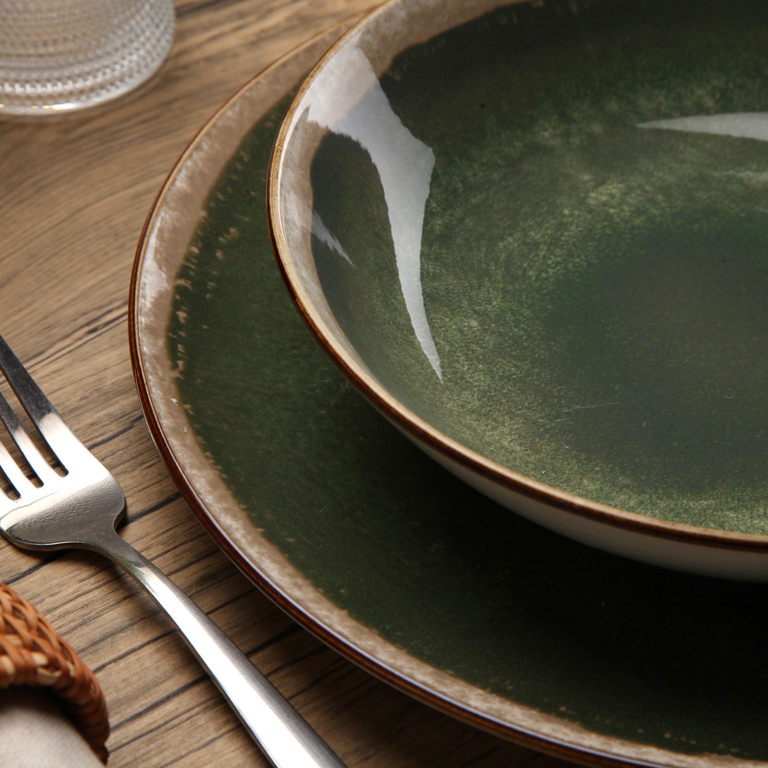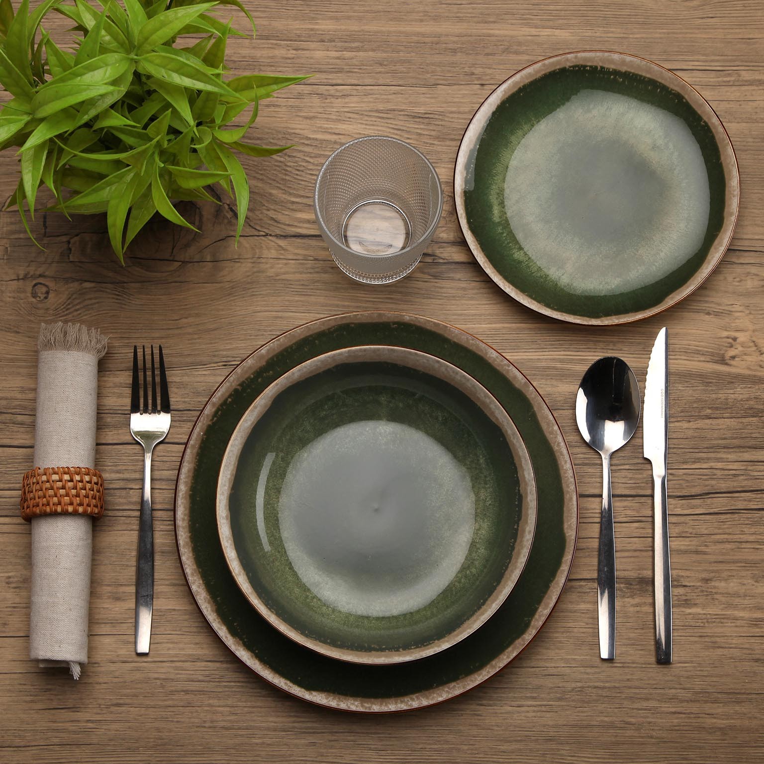 The deep green and neutral tones create a rustic yet modern aesthetic, seamlessly complementing various decor styles.
