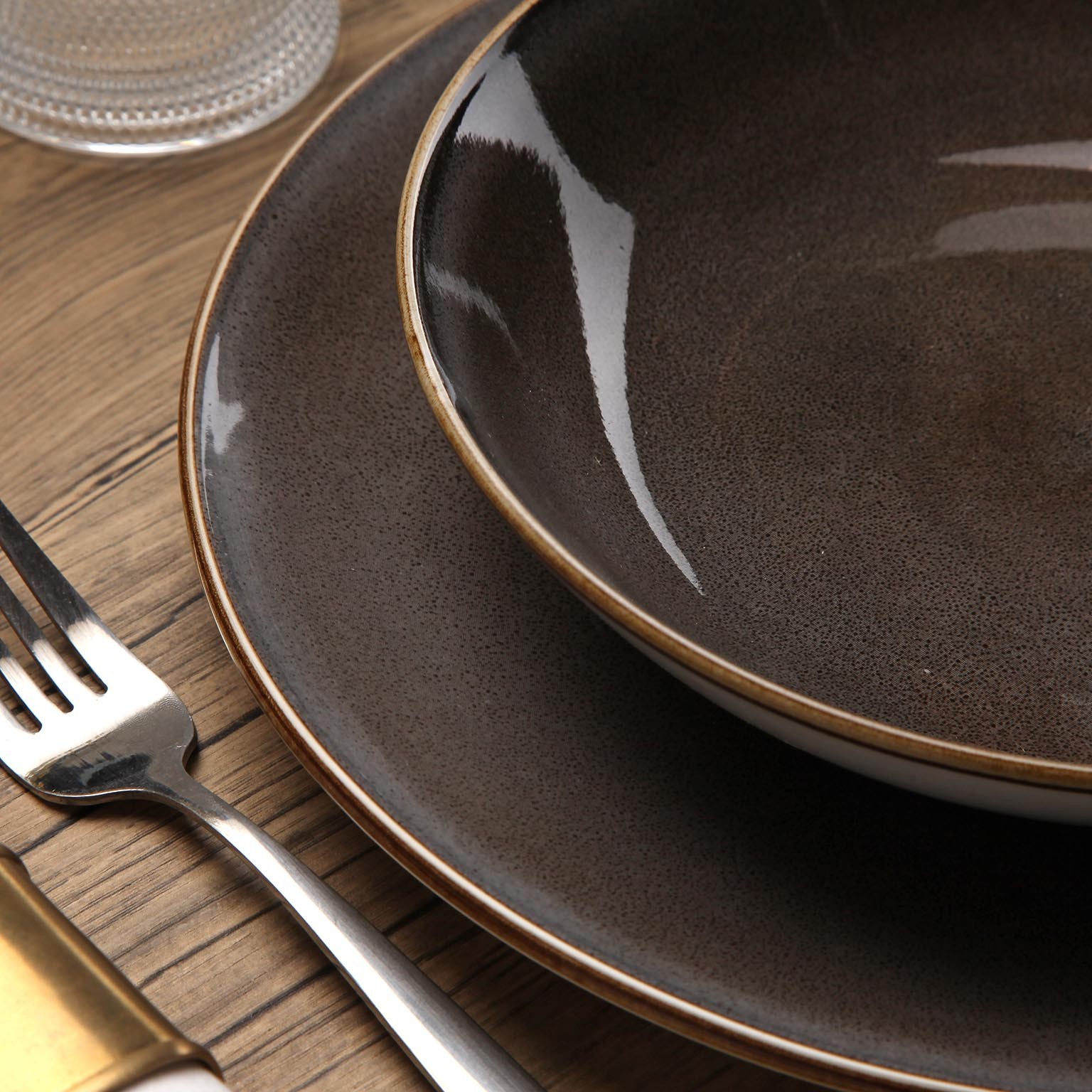 Crafted from durable porcelain, this set includes 6 flat plates (26,5cm), 6 deep plates (20cm), and 6 dessert plates (19cm), all featuring a modern, minimalist design in dark tones with subtle white accents and metallic trim.