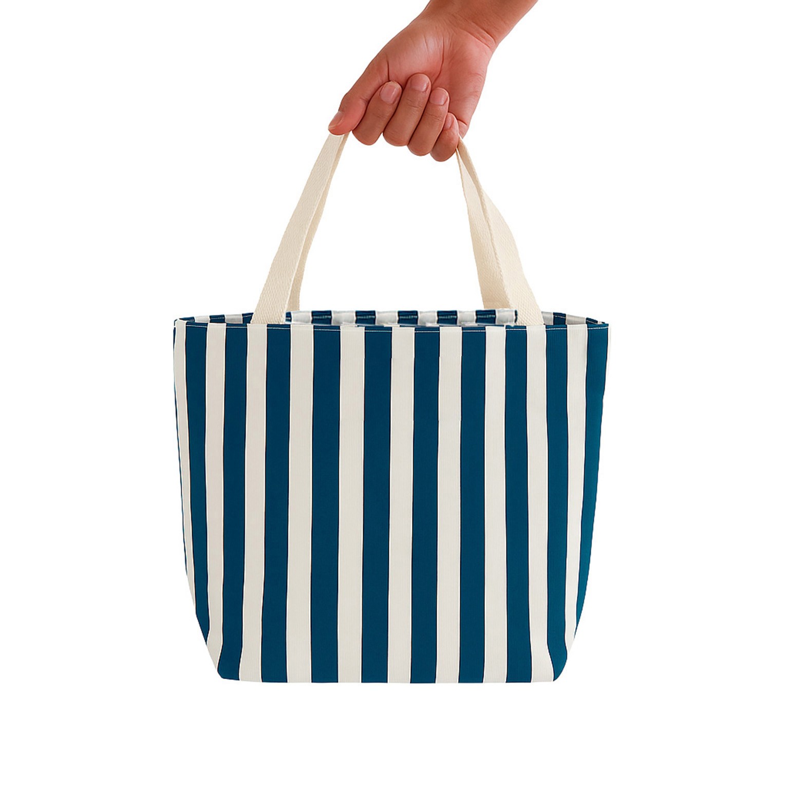 Crafted from a blend of cotton and polyester, this bag features a chic navy blue and white striped pattern, adding a contemporary touch to any bathroom or dressing area.