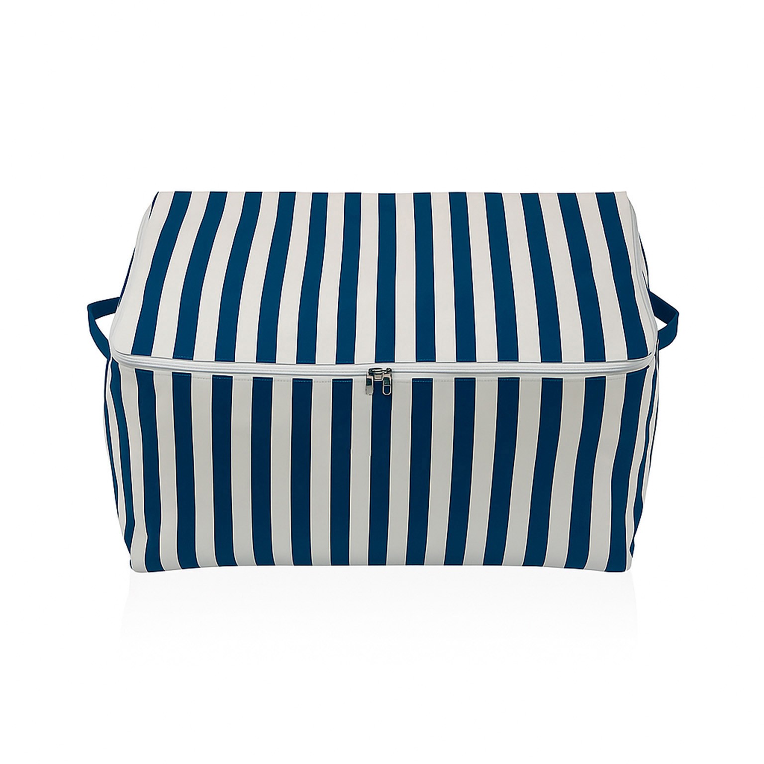 Its navy blue and white striped pattern complements various decor styles, making it suitable for bathrooms, bedrooms, or living areas.
