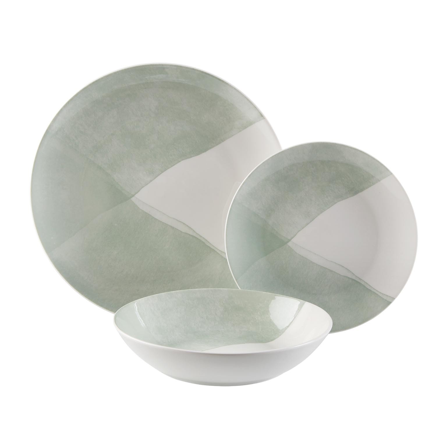 This set includes 6 flat plates (26,5 cm), 6 deep plates (20 cm), and 6 dessert plates (19 cm), all crafted from durable porcelain.
