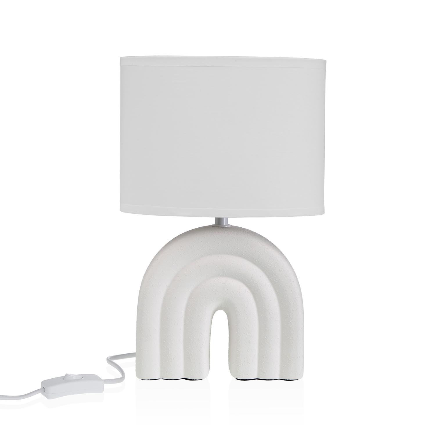 Crafted from durable ceramic, the lamp features a sleek white base and a soft textile shade, measuring 31,5 cm in height and 20 cm in both width and length.