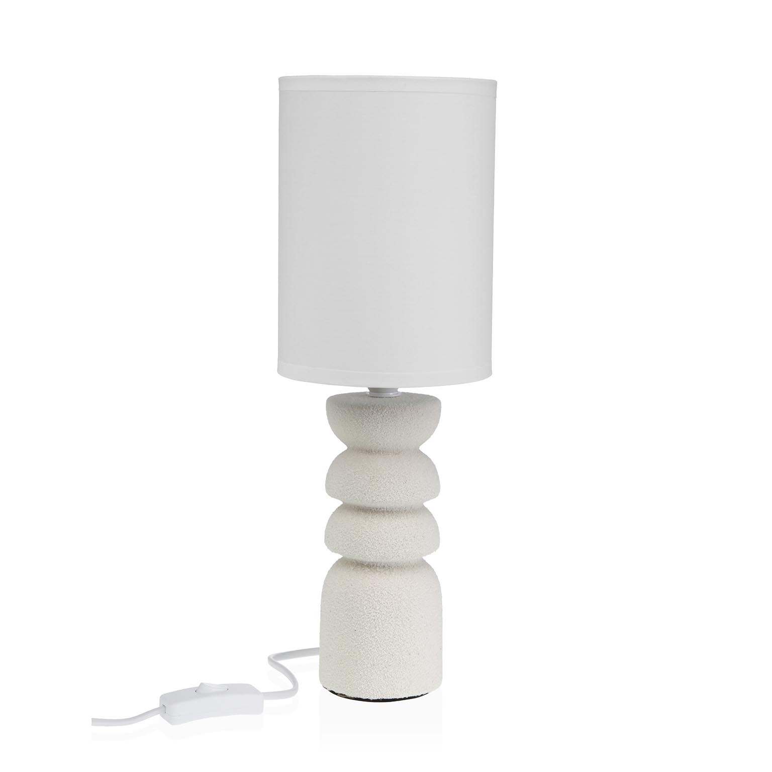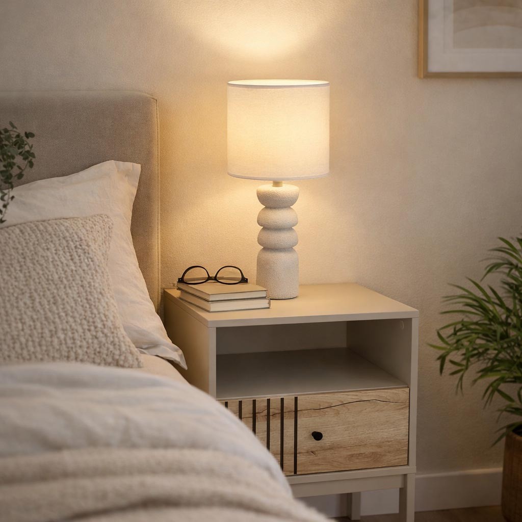 The light neutral ceramic base pairs seamlessly with a crisp white linen shade, providing warm ambient lighting.