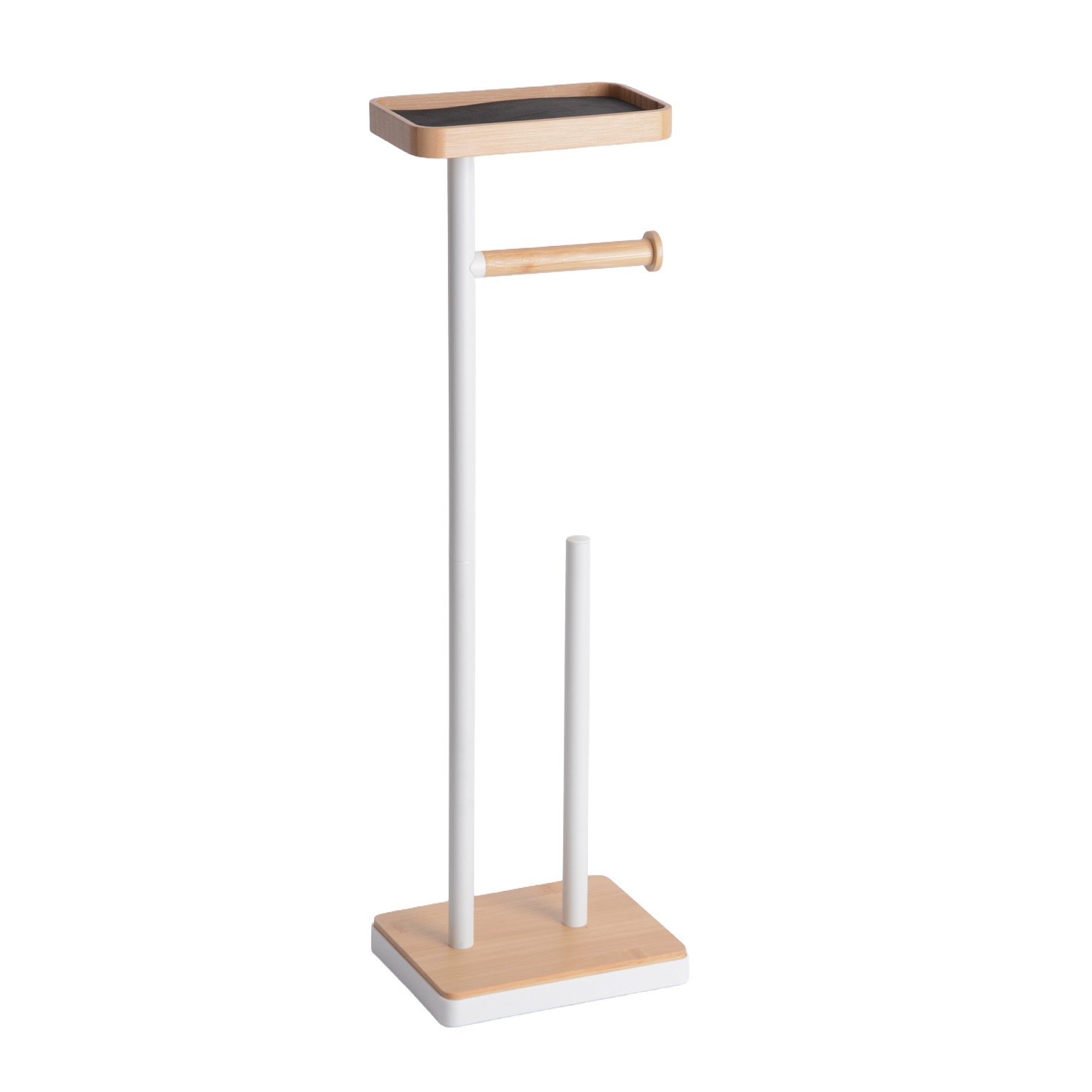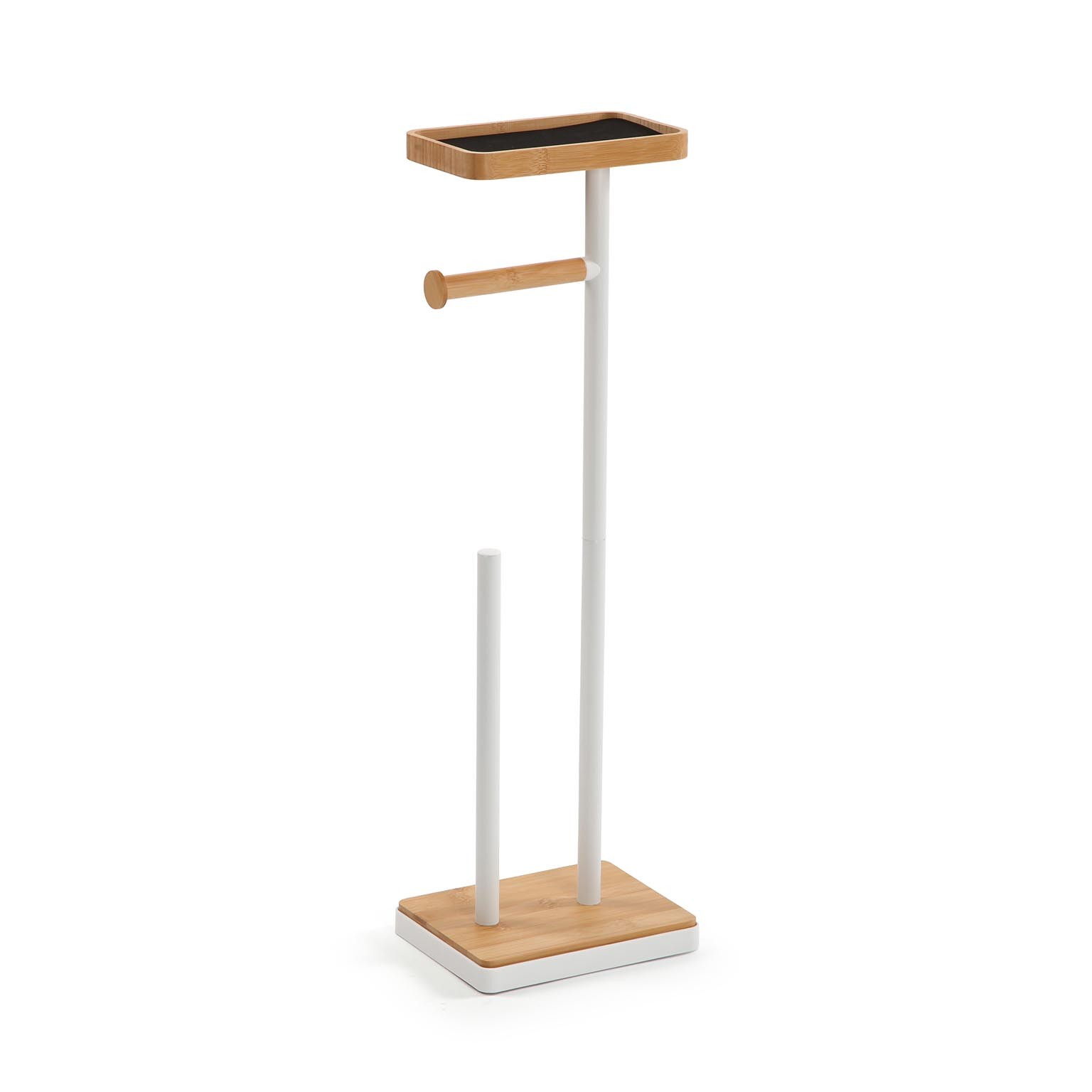 Enhance bathroom functionality with this modern white toilet roll holder, crafted from a blend of bamboo, iron, and polypropylene.