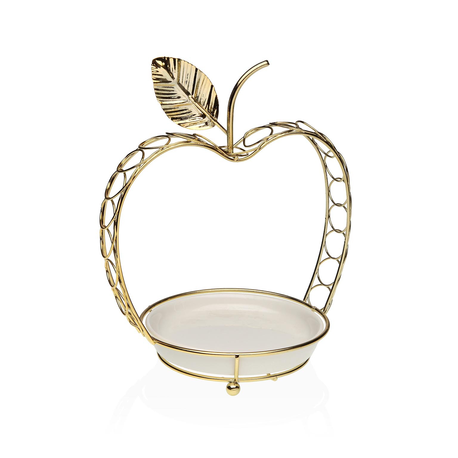 Standing at 20 cm tall and measuring 12,5 cm in width and 16,7 cm in length, this modern piece features a whimsical apple design with a gold metal frame and a pristine white ceramic base.