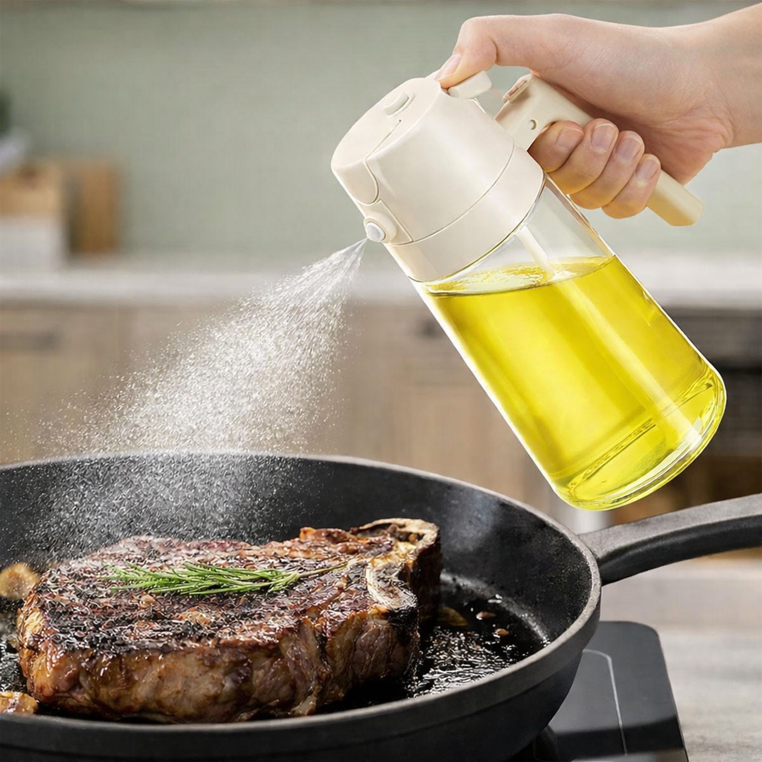 The plastic spray mechanism ensures a fine mist application, perfect for controlling oil portions in cooking and garnishing.