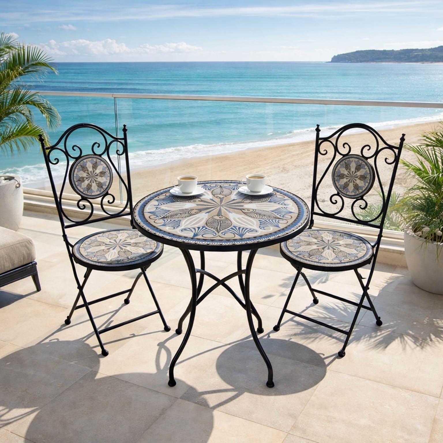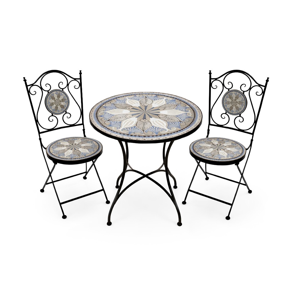 Enhance outdoor spaces with the Coya Table and 2 Chairs Set, crafted from durable metal with a striking blue and white decorative tabletop.