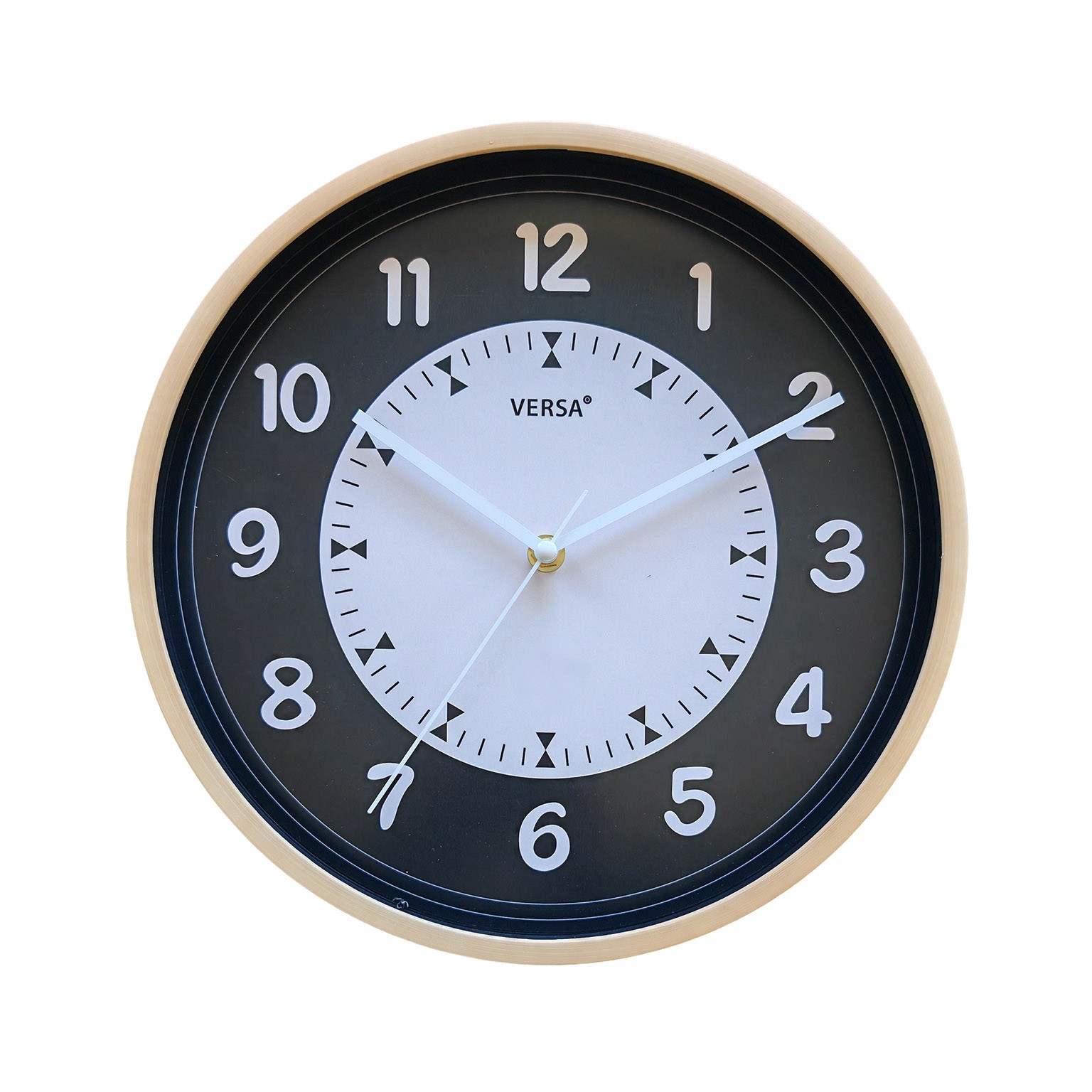 This wall clock features a classic design with a black face and white numerals, set within a natural wood-tone frame.