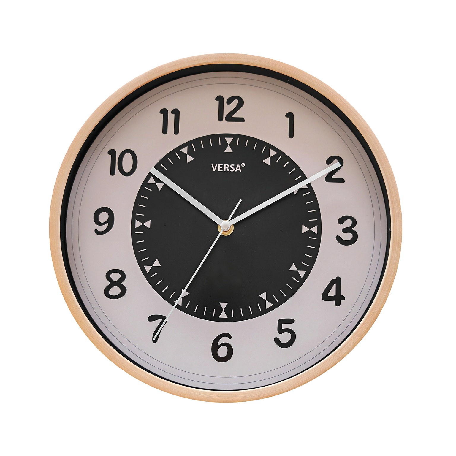 This wall clock features a classic design with a white face and contrasting black numbers and hands, set within a natural wood frame.