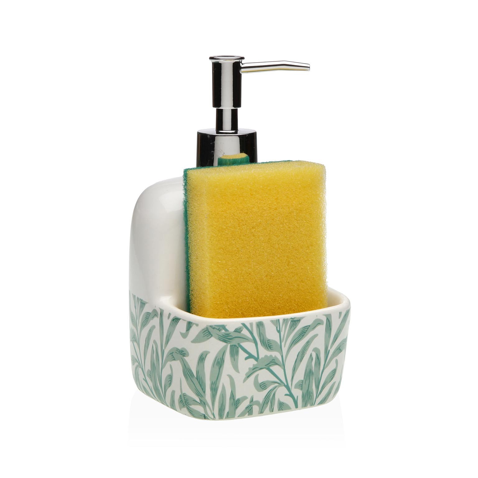 Standing at 17,8 cm in height, with a width of 9,4 cm and a length of 10,5 cm, this functional piece features a durable ceramic body adorned with elegant green leaf patterns, complemented by a sleek metallic silver pump.
