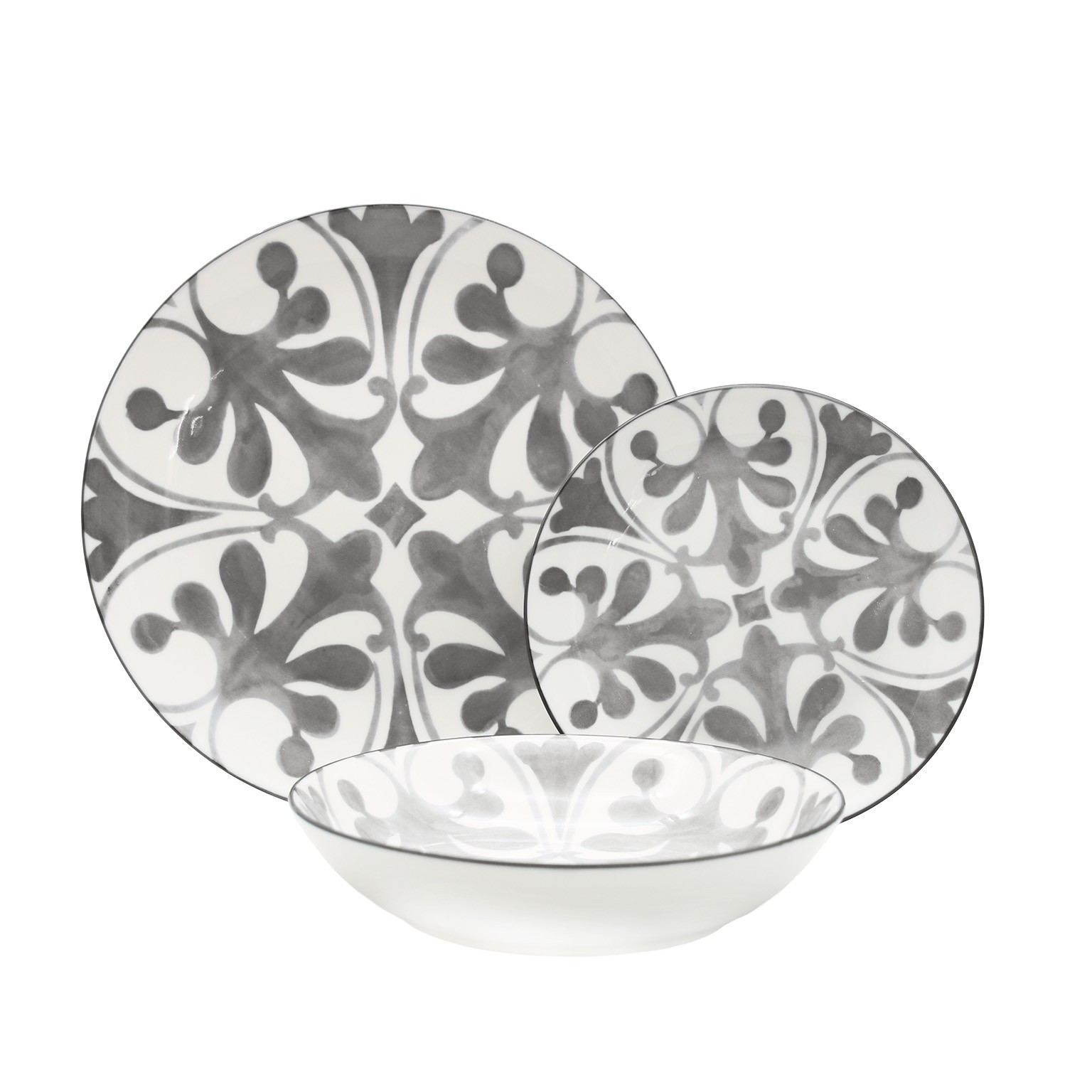 Crafted from fine porcelain, this set includes six dinner plates (26,5 cm), six soup plates (23 cm), and six dessert plates (20 cm), ensuring a complete dining experience.